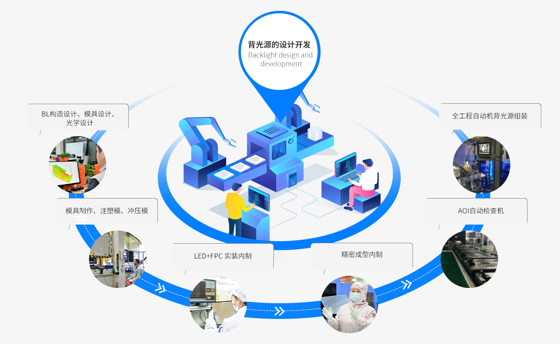 公司深耕背光顯示模組領域;通過持續(xù)不斷的技術創(chuàng)新;不斷加深的一體化生產能力;持續(xù)打造技術領先、質量過硬、服務周全的優(yōu)質產品。通過多年模具設計及制作經驗,利用日本高精度模具加工等設備;緊貼客戶需求,重視產品組合開發(fā),向客戶提供一站式專業(yè)產品及技術解決方案。